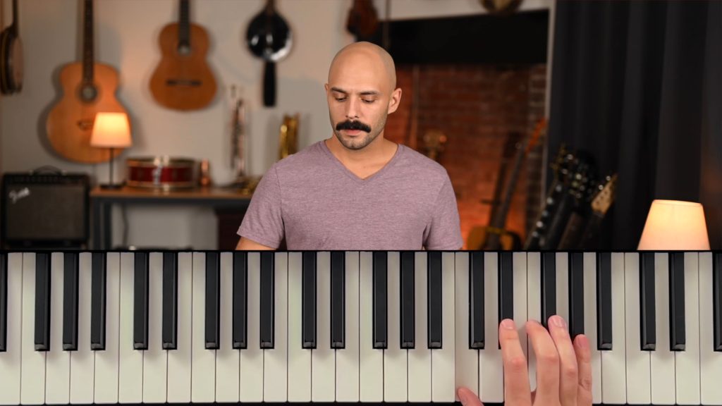 - Learn to play with both hands at the piano, improvising melodies with your right hand and chords with your left.